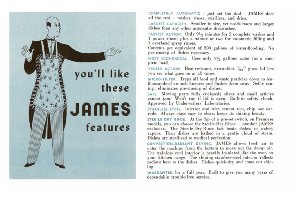 The James Dishwasher was one of the modern miracles of its time and if you were lucky you had one in your home. Since the dishwasher was not fully integrated into most American households until the mid to late 1960s, families really ranked in the 50s and early 60s if they had a “James.”